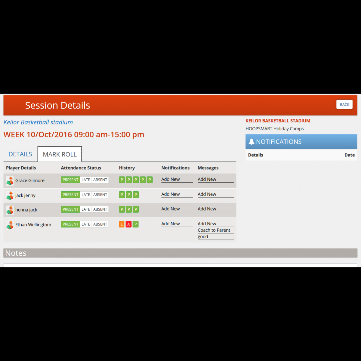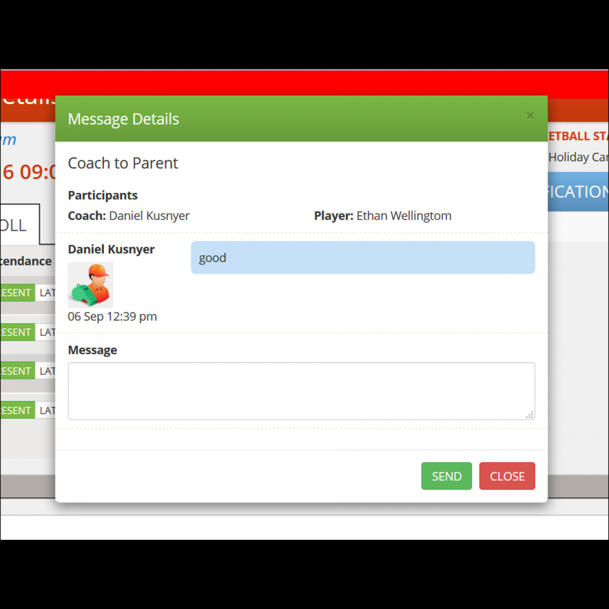 The responsibility of a coach will be to mark attendence of each child attending his program, coach can send a message to child's parent if he/she is late or absent for a session that he/she is enrolled for.